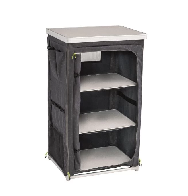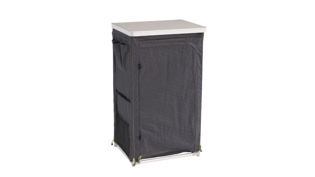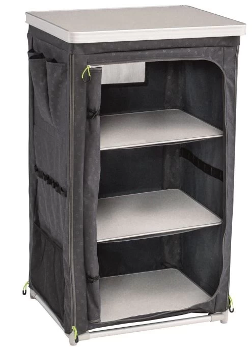 The Milos Cupboard from the Outwell Furniture Collection features three shelves with a zipped door keeping belongings out of sight. There are pockets and hanging points to add further storage for smaller items as such keys and phones.