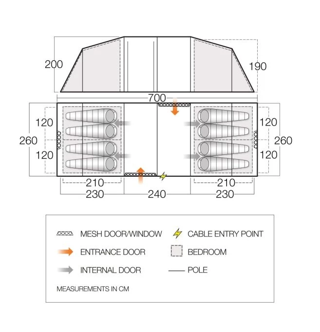 Airflow vents have been incorporated into the design to increase airflow and ventilation. The separate bedrooms each sleep up to 4 people and provide greater privacy than a standard tent design.